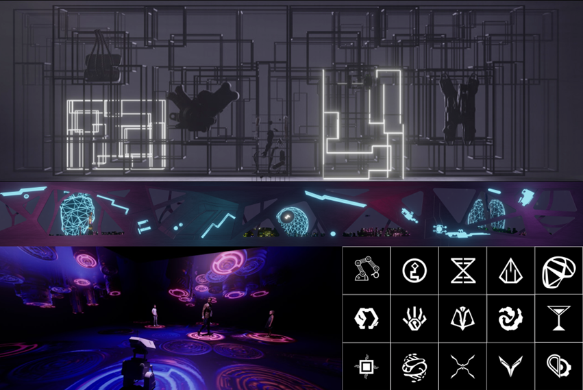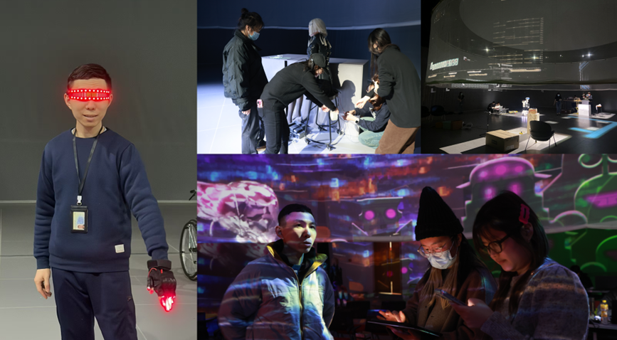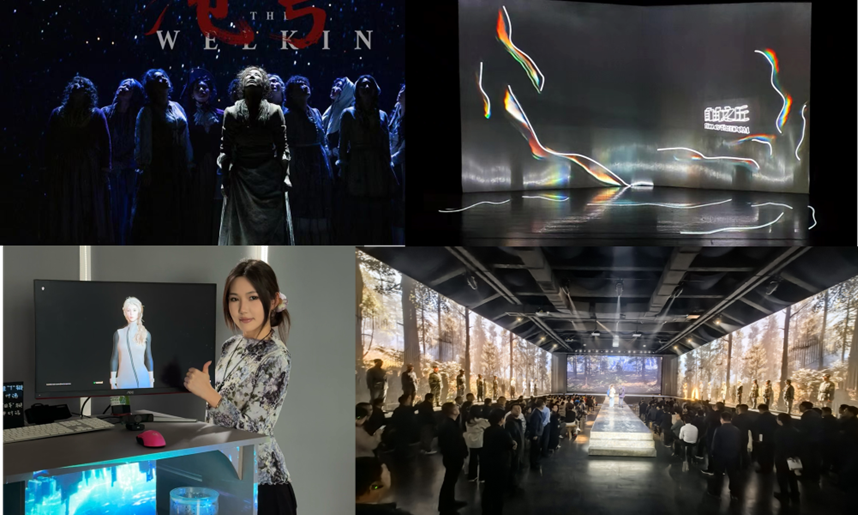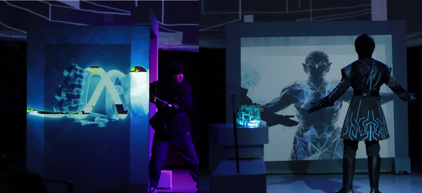 于是,2025年,我把这样的模式,从研究生项目拓展到了更为广泛而基础的本科生教学体系里,在我所教学的校级规划重点课程《投影与戏剧》中,引入了剧场现场的模式,在XR剧场里,进行”编创排投”四位一体的教学模式,孵化了第二部全景新媒体剧场作品人工智能戏剧《微秒间》。