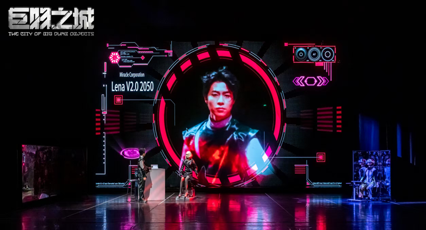 随着梁跃的设计落地,《巨物之城》拥有了一个结合了便捷性、未来感、视觉交互可能的舞台效果,8道可移动的镜面景片伴随升降纱幕投影,避免了投影干扰问题的同时,满足了调度切换,最重要的是自由而智慧地营造了未来机器人与人和谐相处的时空可能。而这,也为后来演化镜框舞台的巡演版提供了可能。