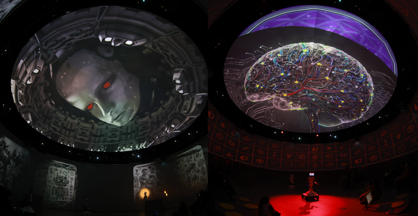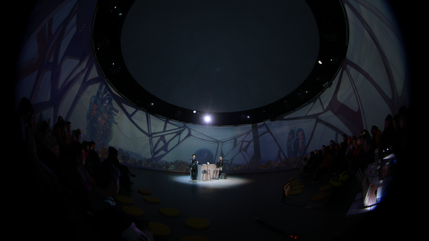 由穹顶天幕和环幕所组成的包裹感空间,营造了巨物悬顶的震撼效果。而观众在720度的U型观众席中,拥有更多自由和欣赏视角,这种多视点的剧场视觉构作对于调度和表演极大的支持和补充。