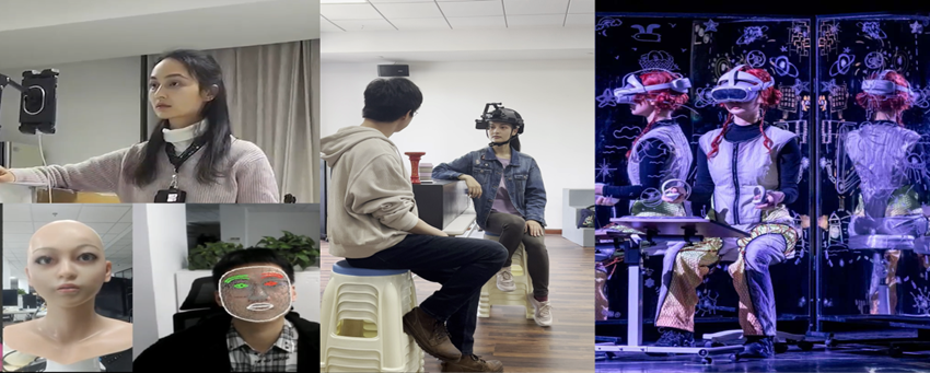 为了让仿真机器人有更表现力和交互力,陈思妍和团队一起,从初步的脸部表情采集开始,到运用运动相机实时采集影像,以便表情与表演达到同步,到最后和机器人团队一起,确认利用VR技术,让演员实时控制机器人的行动,达到机器人角色演员三合为一的效果,而这种身份的重叠思辨性,直接让剧组修改了原有的剧情和表现力,突出强化了机器人戏剧中特有的关于机器人身份性的辩证思考。