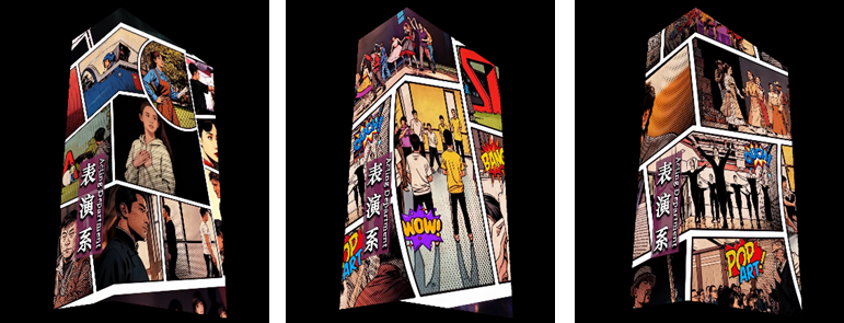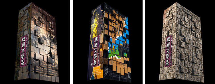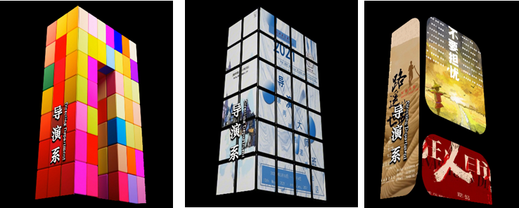 视觉中心是一个不断组合、拆解与重构的魔方,每一方块都代表一种独特的舞台元素——剧本、灯光、调度或演员表演。魔方表面贴附着导演系学子创排的优秀剧目海报及大师班活动的珍贵影像,象征着导演工作正是在无数创意模块中,构建出属于自己的完整世界。