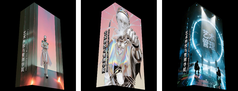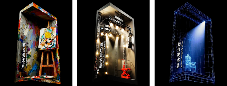 在舞台美术系板块,AI技术更是贯穿全程。团队从核心文案出发,依据不同专业的方向与风格,针对性生成匹配的视觉画面。为确保生成画面与建筑透视完美统一,师生们对AI指令进行了反复调试与优化。即便在最终合成阶段,仍对AI产生的细微透视偏差,借助专业软件逐帧校准,力求尽善尽美。