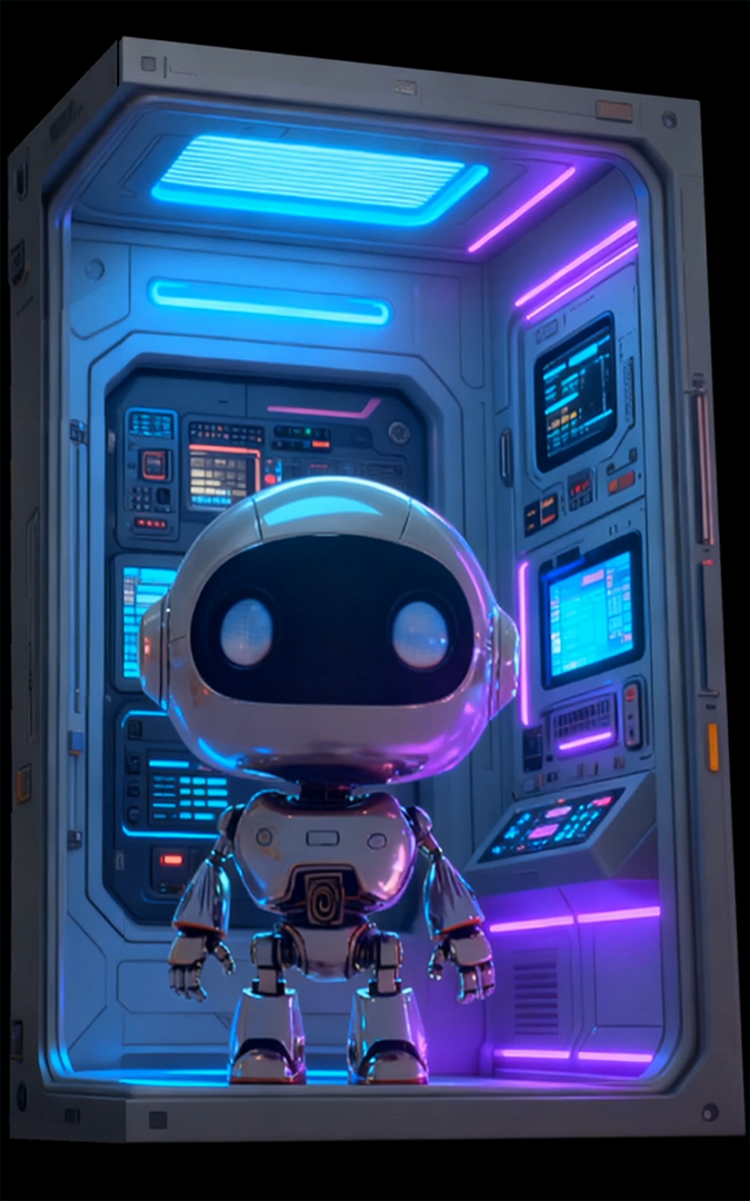 在视角、光效、动效等细节的反复打磨中,项目一度进入深水区。转机出现在11月24日晚,冀宁老师借助AI工具,在首帧画面的基础上,逐帧对小机器人动作做了连贯延伸,三小时完成了动效生成与合成,产出了接近成片效果的版本,在25日汇报中成片内容通过。自此,后续工作进入了高效的微调阶段。